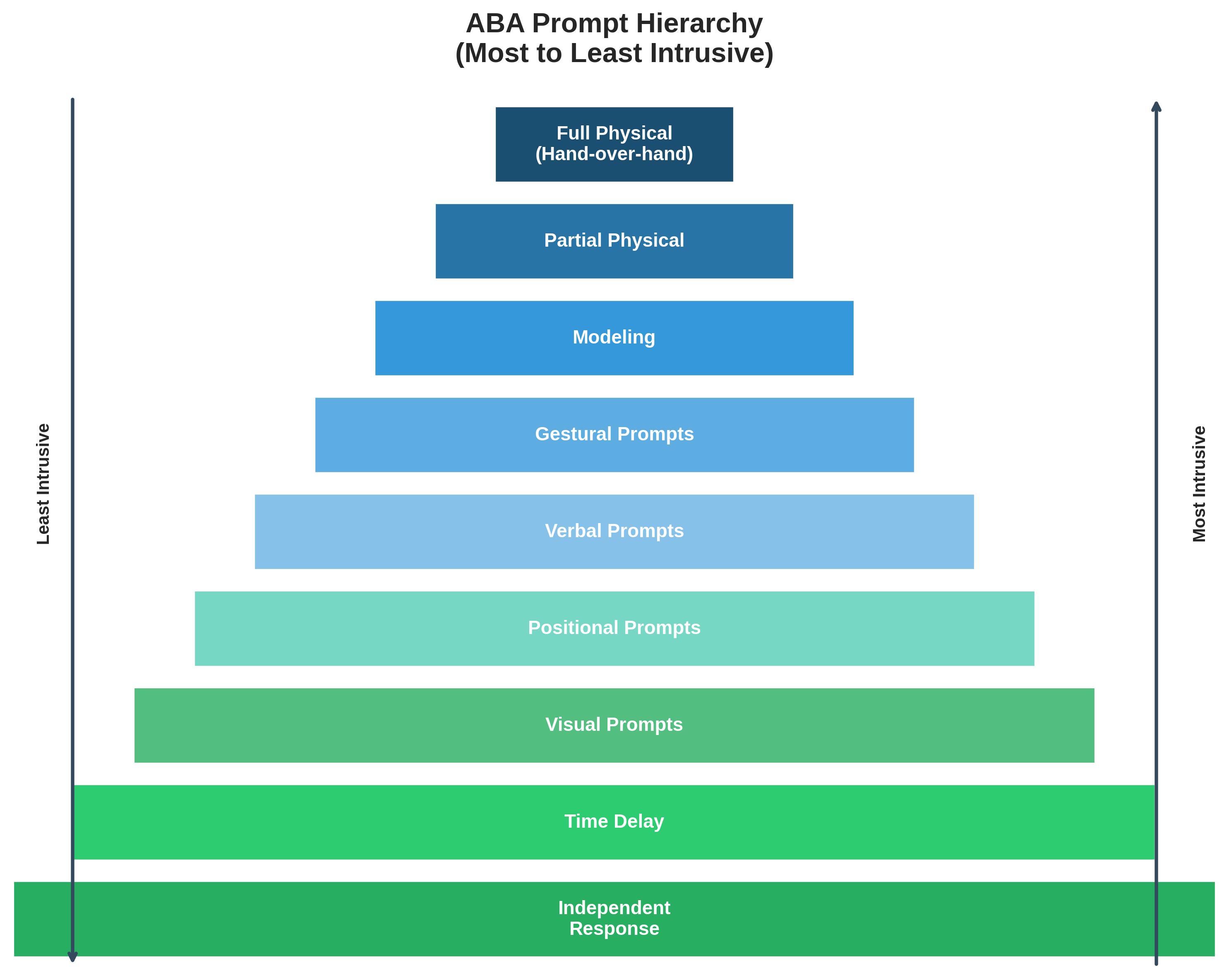 The prompt hierarchy is often visualized as a pyramid or a continuum, with the most intrusive prompts at the bottom and the least intrusive at the top. The goal is always to use the least intrusive prompt necessary to ensure the learner's success and to fade to independence as quickly as possible. The following are the main levels of the prompt hierarchy, from most to least intrusive:
